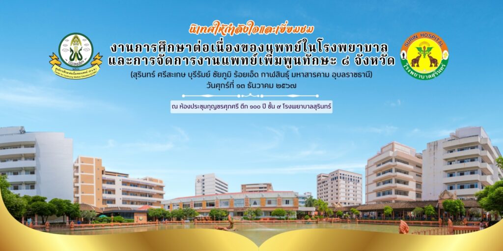 ประชุมการนิเทศให้กำลังใจและเยี่ยมชมงานการศึกษาต่อเนื่องของแพทย์ในโรงพยาบาล และการจัดการงานแพทย์เพิ่มพูนทักษะ 8 จังหวัด (จ.สุรินทร์, จ.บุรีรัมย์, จ.ชัยภูมิ, จ.มหาสารคาม, จ.ร้อยเอ็ด, จ.ศรีสะเกษ, จ.อุบลราชธานี และจ.กาฬสินธุ์) วันศุกร์ที่ 13 ธันวาคม 2567 เวลา 09:00 – 14:00 น. ณ ห้องกุญชรศุภศรี ตึก 100 ปี ชั้น 9 โรงพยาบาลสุรินทร์ ภาพบรรยากาศภายในงานประชุม