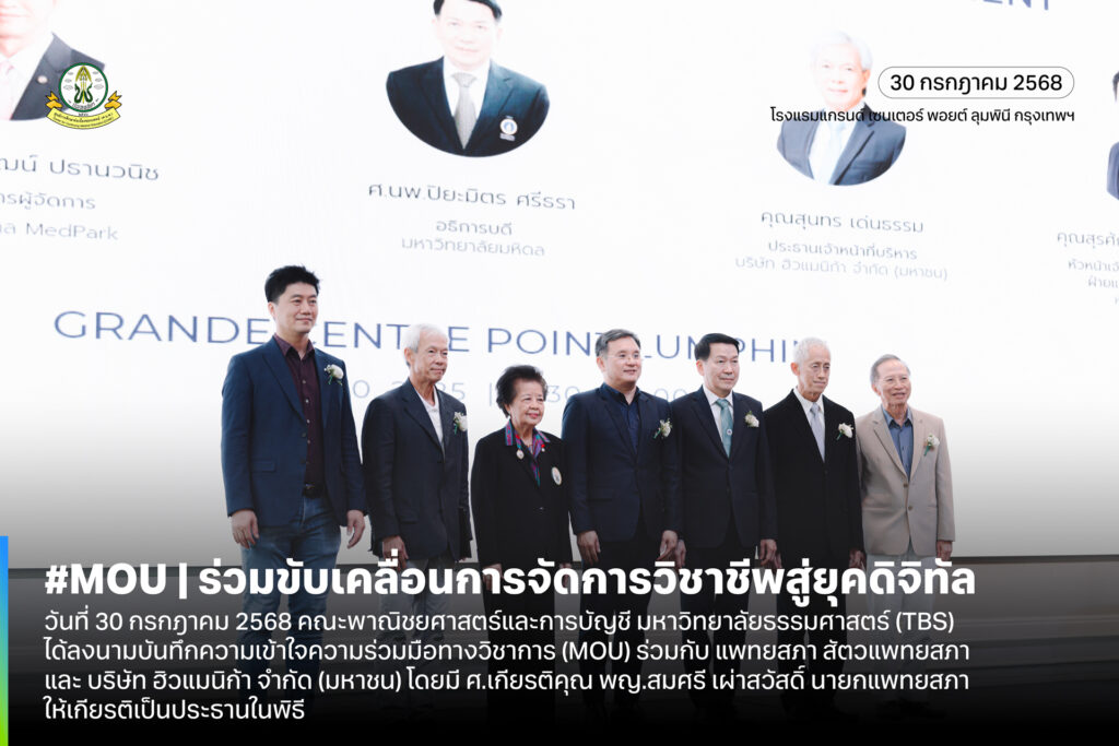 #MOU | ร่วมขับเคลื่อนการจัดการวิชาชีพสู่ยุคดิจิทัลวันที่ 30 กรกฎาคม 2568 คณะพาณิชยศาสตร์และการบัญชี มหาวิทยาลัยธรรมศาสตร์ (TBS) ได้ลงนามบันทึกความเข้าใจความร่วมมือทางวิชาการ (MOU) ร่วมกับ แพทยสภา สัตวแพทยสภา และ บริษัท ฮิวแมนิก้า จำกัด (มหาชน) โดยมี ศ.เกียรติคุณ พญ.สมศรี เผ่าสวัสดิ์ นายกแพทยสภา ให้เกียรติเป็นประธานในพิธีพิธีลงนามครั้งนี้นำโดยคณะพาณิชยศาสตร์และการบัญชี มหาวิทยาลัยธรรมศาสตร์o รศ.ดร.สมชาย สุภัทรกุล คณบดีo คุณสุพจน์ เรืองรองหิรัญญา ผู้ช่วยคณบดีฝ่ายยุทธศาสตร์ และผู้อำนวยการศูนย์ CONCศูนย์การศึกษาต่อเนื่องของแพทย์ (ศ.น.พ.) แพทยสภาo ศ. นพ.สมเกียรติ วัฒนศิริชัยกุล ผู้อำนวยการo คุณดวงแก้ว ศรีชมชื่น เจ้าหน้าที่บริหารงานทั่วไปศูนย์การศึกษาต่อเนื่องทางสัตวแพทย์o รศ.น.สพ.ดร.ธีระ รักความสุข นายกสัตวแพทยสภาo สพ.ญ.คชาภรณ์ เต็มยอด ผู้อำนวยการบริษัท ฮิวแมนิก้า จำกัด (มหาชน)o คุณสุนทร เด่นธรรม ประธานเจ้าหน้าที่บริหารo คุณชื่นชม เตชรุ่งเกียรติ ความร่วมมือครั้งนี้มีเป้าหมายเพื่อส่งเสริมและพัฒนาองค์ความรู้ด้านการจัดการ เทคโนโลยีระบบงาน และการยกระดับศักยภาพบุคลากรในสายวิชาชีพ ทั้งด้านการแพทย์ การสัตวแพทย์ และการบริหารจัดการ ให้มีประสิทธิภาพและยั่งยืนภายในงานยังมีเวทีเสวนาพิเศษ “Embracing Digital Evolution for Effective Medical Professional Management” เพื่อแลกเปลี่ยนมุมมองจากผู้ทรงคุณวุฒิ ทั้งด้านการแพทย์และธุรกิจ เกี่ยวกับการเปลี่ยนผ่านสู่ยุคดิจิทัลและการบริหารจัดการบุคลากรอย่างมีประสิทธิภาพ#CCME #ContinuingMedicalEducation #MedicalManagement #DigitalTransformation #CONCThammasat #ThammasatBusinessSchool #TBS