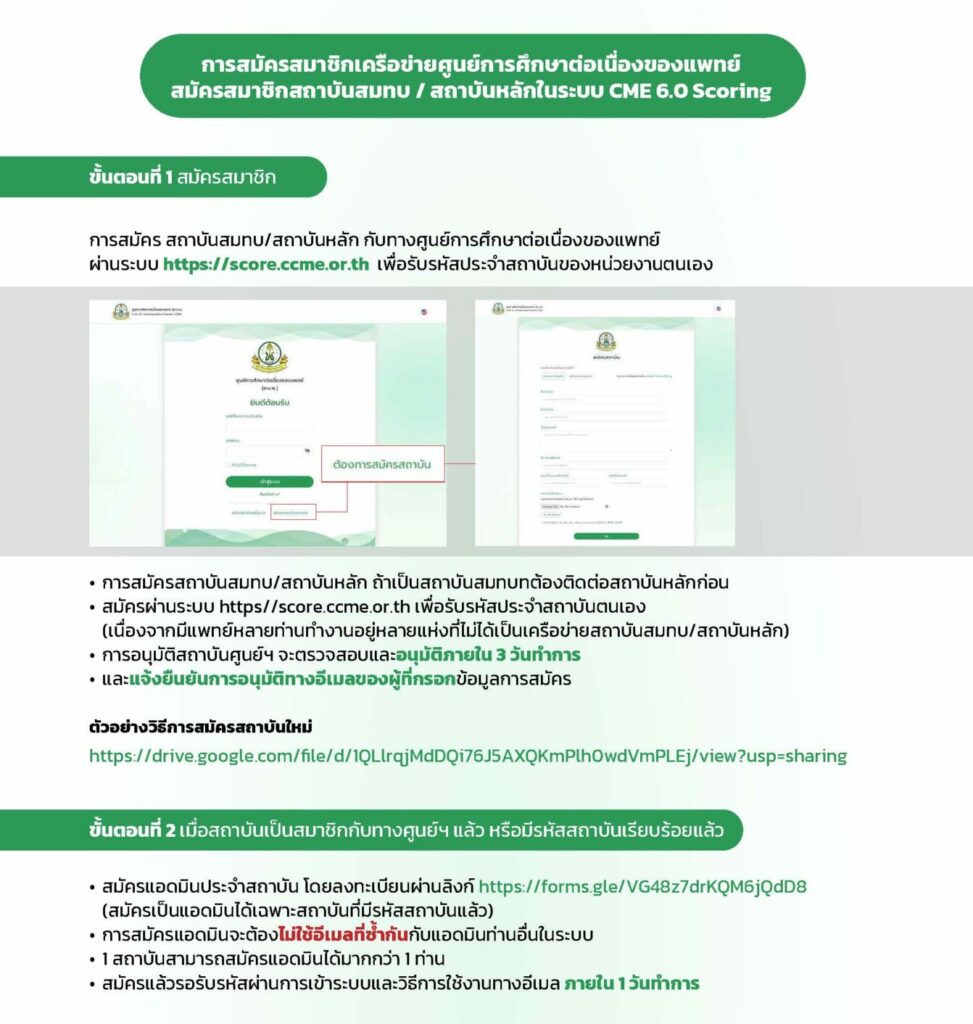 Download Button Download คู่มือการใช้งาน วิธีใช้งานเข้าระบบ CME 6.0 กรณีข้อ 1: แพทย์ไม่มีชื่อในระบบ หากแพทย์ไม่มีชื่อในระบบ ให้ทำการลงทะเบียนที่หน้าเว็บ https://score.ccme.or.th และเลือกหัวข้อ “สมัครสมาชิกครั้งแรก” จนท.จะเปิดสิทธิเข้าใช้งานภายใน 1 วันทำการหรือเร็วกว่านั้น เข้าระบบครั้งแรกให้ได้ก่อนเริ่มสแกนเก็บคะแนน หากไม่มีชื่อในระบบ อาจเป็นเพราะ: แพทย์ยังไม่ได้ลงทะเบียน ในระบบไม่มีข้อมูลอีเมลของแพทย์ ให้แจ้งข้อมูลตามกรณีข้อ 3 **แพทย์ที่สแกนคิวอาร์โค้ดไม่ทัน แจ้งกับสถาบันผู้จัดกิจกรรมเพื่อเก็บคะแนนย้อนหลัง กรณีข้อ 2: ลืมรหัสผ่านหรือเข้าระบบไม่ได้ หากแพทย์ต้องการเข้าระบบหรือจำรหัสผ่านไม่ได้ ให้เข้าเว็บ https://score.ccme.or.th และเลือกหัวข้อ “ลืมรหัสผ่าน” ดำเนินการรีเชตพาสเวิดด้วยตนเองและยืนยันข้อมูลทางอีเมลของตนเอง (ตัวอย่างวิธีใช้งาน) เมื่อได้พาสเวิดหรือมีพาสเวิดแล้ว ล็อคอินเข้าระบบที่เว็บไชต์ https://score.ccme.or.th Username: …(เลข ว.).. Password: …(พาสเวิดที่ได้จากการรีเชต/ที่มีพาสเวิดแล้ว)… กรณีข้อ 3: แพทย์ต้องการเปลี่ยนอีเมล/แจ้งอีเมลใหม่ หากแพทย์ต้องการเปลี่ยนอีเมลหรือแจ้งอีเมลใหม่ ให้ลงทะเบียนแจ้งข้อมูลผ่านฟอร์มนี้ https://forms.gle/tUJFM6XqapX5S8D26 จนท.จะอัปเดตข้อมูลให้ หลังจากนั้นแพทย์สามารถเข้าไปรีเชตรหัสผ่านโดยเลือก “ลืมรหัสผ่าน” ที่ https://score.ccme.or.th คู่มือการใช้งาน Download 1 เอกสารคู่มือกิจกรรมการศึกษาต่อเนื่อง ของศูนย์การศึกษาต่อเนื่องของแพทย์ 2 คู่มือสำหรับสถาบันราชวิทยาลัย 3 คู่มือสำหรับสถาบันหลัก 4 คู่มือสำหรับสถาบันสมทบ 5 คู่มือสำรับแพทย์