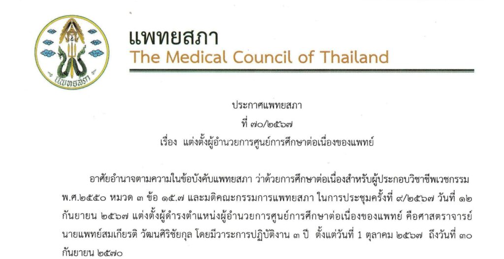 ประกาศแพทยสภา ที่ ๗๐/๒๕๖๗ เรื่อง แต่งตั้งผู้อำนวยการศูนย์การศึกษาต่อเนื่องของแพทย์